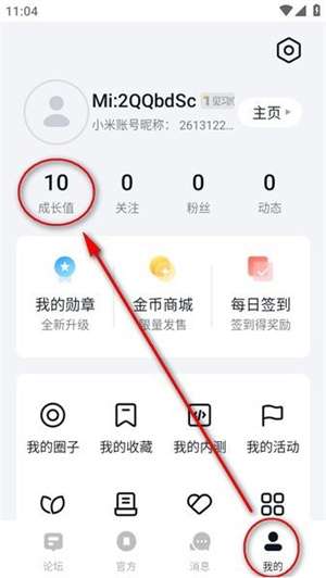 1、首先我们在打开小米社区后,可以看到最下方的四个选项,点击右下角“我的”,并选择“成长值”,如下图;