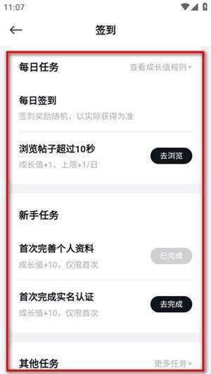 3、当各位进入到新的页面以后,映入眼帘的就是各种任务,包括签到、每日任务、新手任务、其他任务等等,只需要每天都完成这些任务,那么你就能将等级快速提升了。