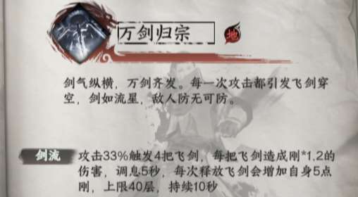 攻击33%触发4把飞剑,每把飞剑造成刚*1.2的伤害,调息5秒,每次释放飞剑会增加自身5点刚,上限40层,持续10秒