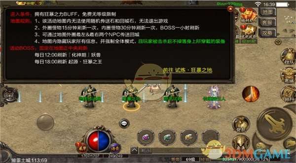 2、100级之后如果还没有转生的话,也无法进入新手试炼,这个时候就可以去高级一点的地图了,例如狂暴之地,进入的要求是必须有狂暴之力buff,在这个地图里面,1转的材料还是十分容易打到的。