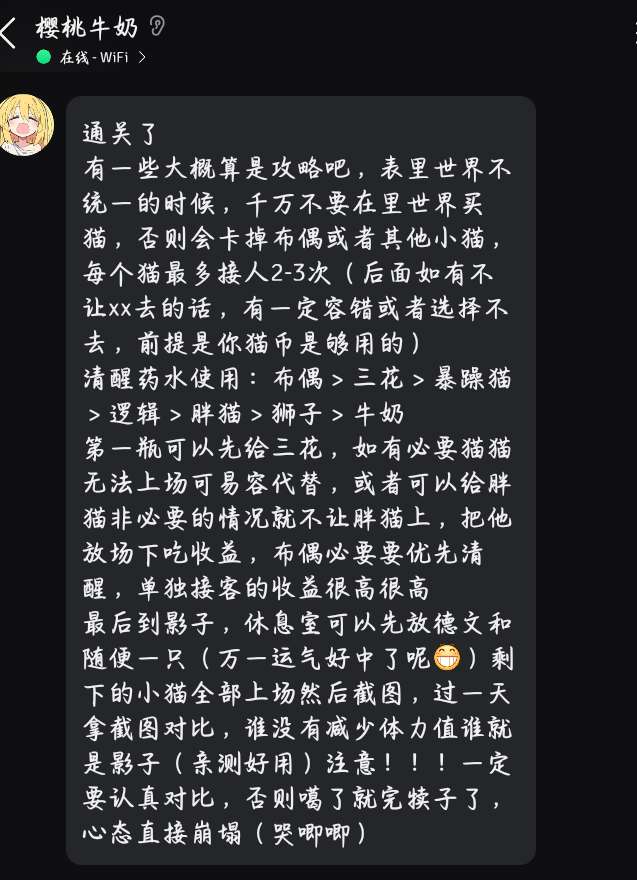 游戏中德文每过三天可以制作一瓶清醒药,清醒药对猫咪使用后可以使其清醒过来,解锁对应的清醒词条,这里就简单说一下清醒药的使用优先级吧(叠甲,仅个人想法)