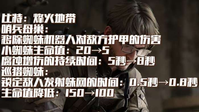 比特在很多烽火行动地图中能有着非常令人头疼的能力,无论是影响状态还是限制进攻都比较得心应手,不少玩家吐槽道“被烦的没脾气”。这次的调整主要针对的就是烽火地带中的比特:移除了蜘蛛机器人对敌人护甲的伤害,并且大幅度削弱了小蜘蛛的生命值,基本上一枪一个了,但是小蜘蛛带来的腐蚀增伤效果的持续时间微微加长了些;比特大招巡猎蜘蛛生命值砍了三分之一,并且锁定敌人发射捕网的时间微微上调了一些,有一定的反应时间但不多。