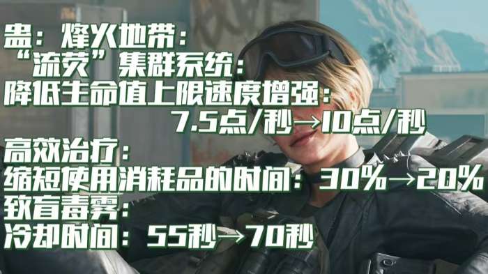 蛊在这一次调整中微微加强了大招降低生命值上限的速度,也就是说被大招影响到会比以前更快地掉状态,但同时蛊的烟雾冷却时长增加,并且被动缩短使用消耗品的时间下调10%,有削弱有增强,依旧非常值得选择。