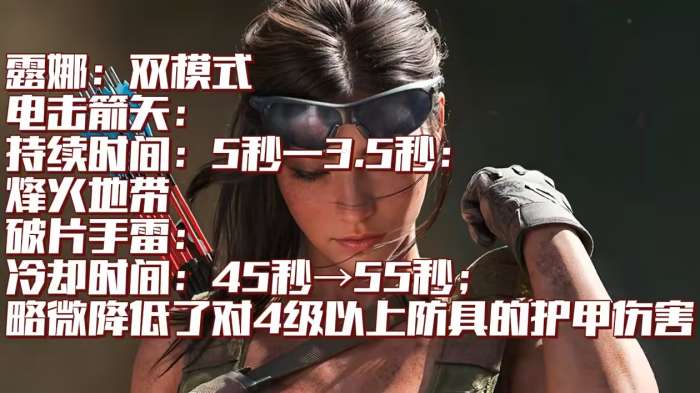露娜这一刀削弱说是“砍到大动脉了”也不为过:双模式中露娜的电击箭持续时间从原本的5秒削减到了3.5秒,持续时间缩短就意味着伤害段数也遭到了削弱(现在的一支电击箭才只能最多触发7段伤害);在烽火地带中露娜的手雷冷却时间也小幅度增加了,并且略微降低了对4级以上防具的护甲伤害。如此一来无论是道具的循环还是对敌人远距离消耗压制都非常受限制和影响,有多少彦祖和亦菲钻研学习的点位可能就发挥不出全部实力了。