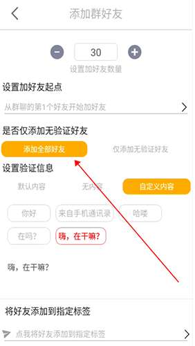 4、这里我们可以选择 添加全部好友与仅添加无验证好友,在需要添加验证好友时,选择或者自定义我们要说的话,归类好友标签就可以发送验证了!