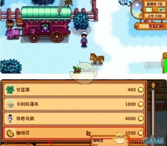 1、我们可以在猪车这里,和NPC互动后购买咖啡豆,猪车是随机刷新的;