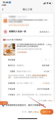 5、选择好之后,在确认订单页面我们能看到已使用领取的优惠券,然后点提交订单,就和在淘宝买东西是一样的。