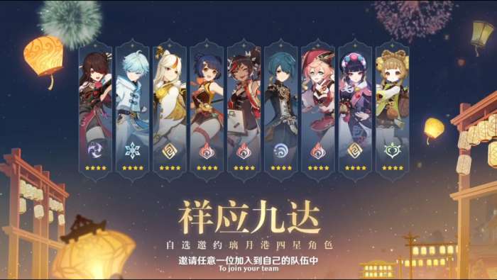 一共「光焰蹈跃」、「纸映成戏」、「烟海梭巡」和「灯后勤绩」4个玩法,可自选邀约璃月港4星角色。