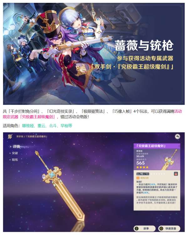 一共「奔霆腾闪」、「疾雷攻逐」、「电威横织」和「机巧阵陔」4种主题玩法,可以免费获得一个4星角色「北斗」,是一个雷系副c。