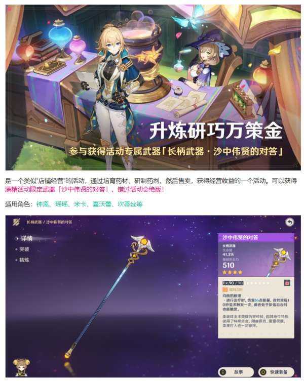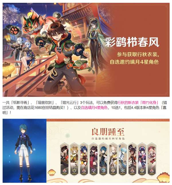 一共「月章星句」、「机关棋谭·巧策之局」、「孤剑争逐」和「花影瑶庭」4种玩法,可以免费获得一个4星角色「行秋」,是一个极其优秀的后台挂水副c角色,可以用的关服的那种。