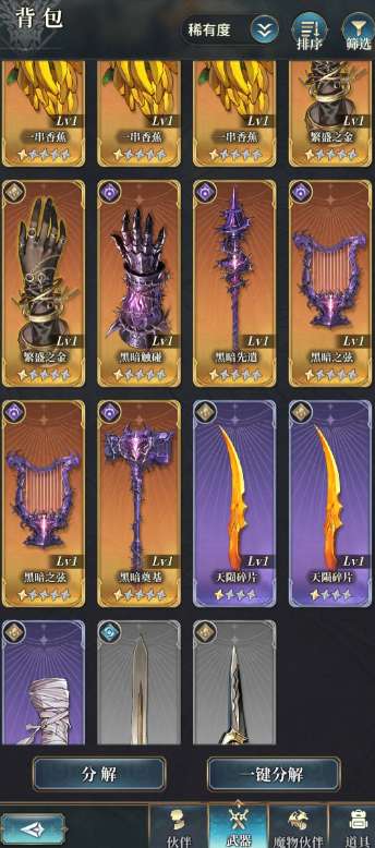 游戏内武器装备的品质,可以分为金色、紫色、蓝色、绿色、白色,紫色以下的装备除了前期过度使用,后期和中期基本上没有更高的发展空间,建议玩家直接通过武器分解来换算成为基础升级材料,金色装备和紫色装备,可以通过组成同一个武器套件,来增加攻击效率。