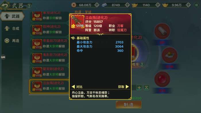 学习武器制造,可打造各职业的武器,一定概率获得进化2的神兵利器