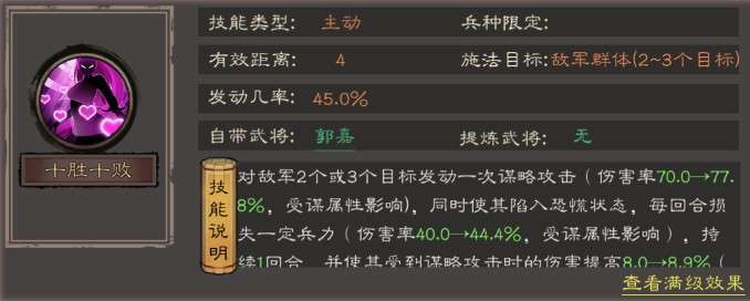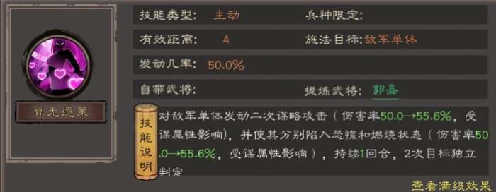 效果:对敌军单体发动2次谋略攻击,附加恐慌+燃烧双状态,适合作为郭嘉的补伤技能,强化单体压制能力。