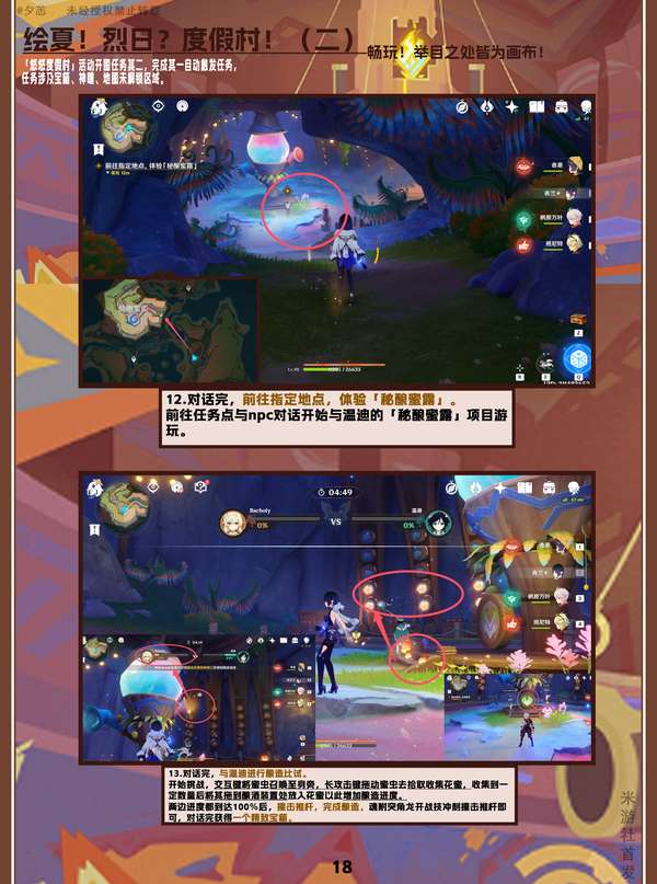 任务涉及区域「悠悠度假村」中的地区「彩彩崖」(P1一P3)、「刺梨岩」(P4一P8)、「浪浪湾」(P9一P14)和「提提岛」(P15一P20)项目的游玩。