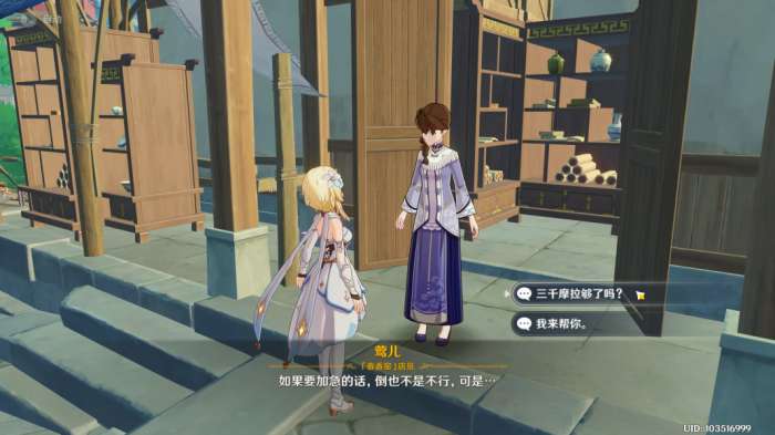 莺儿会找旅行者要钱加急,或者亲自帮她,选摩拉的话会直接拿到香膏。