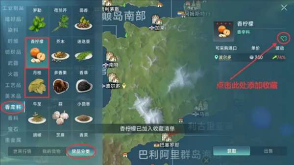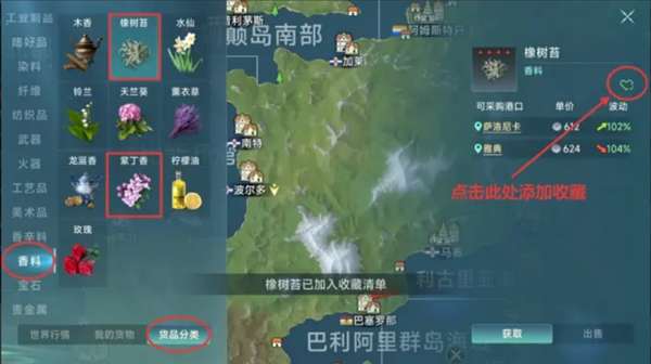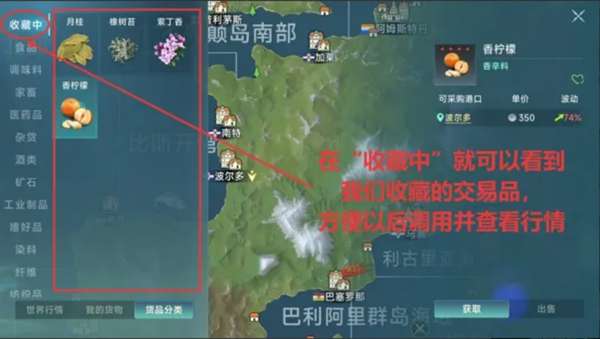 打开右上角的小地图,在货品分类中找到四种交易品:紫丁香、橡树苔、香柠檬、月桂,并把它们收藏下来。
