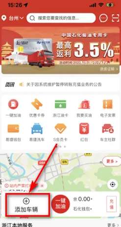 1、想要添加车辆,打开易捷加油软件进入到主页后点击【添加车辆】功能。