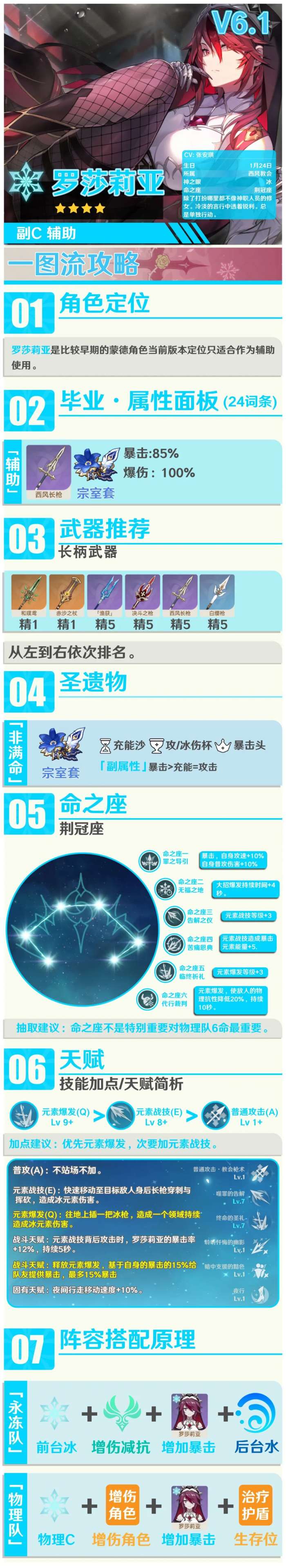 罗莎莉亚虽然有后台挂冰和暴击拐,但和现在的辅助比还是略显单薄,人数不够的时候拿来凑双冰倒是不错,现在倒是也能破天马的机制,其余情况就没什么发挥空间了。