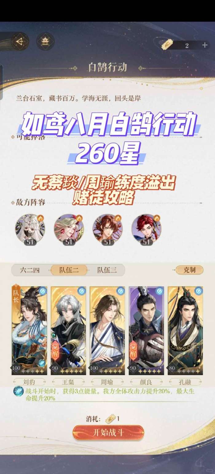 软件提交 专题合集 热门手游如鸢八月白鹄行动怎么过?如鸢游戏以策略卡牌和沉浸式剧情为核心玩法,玩家只需完成指定任务和剧情对话就能快速通关。游戏中有白鹄行动玩法,玩家可以通过这一玩法获得大量密探培养材料,那么八月这一玩法应该怎么260星通关呢?小编为你准备了一份攻略,一起来看看吧。