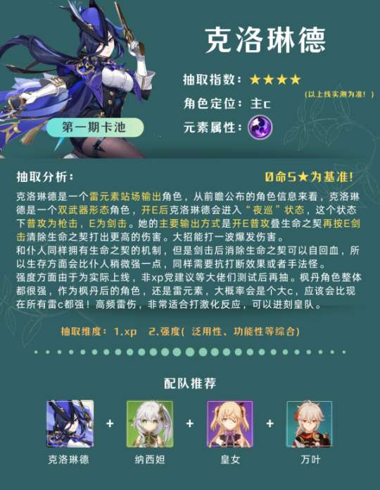 克洛琳德的特效很漂亮,但是作为雷系c,其元素属性受到了一定的限制。目前主要是通过激化类反应提高队伍总输出,建议在大量实测后再考虑是否抽取。