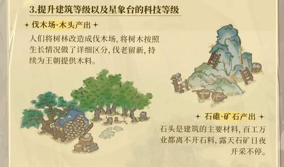 伐木场可以产出木头,而采矿场能产出矿石,木头和矿石可以用来提升法台的科技等级以及建筑等级。