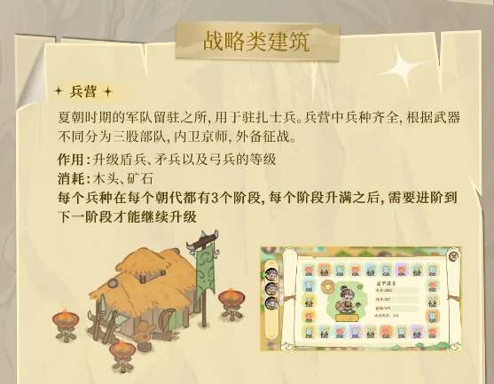 兵营可以帮助升级盾兵、矛兵和弓兵的等级,需要消耗木头和矿石,不过需要注意兵种会有不同的阶段,大家将一个阶段升满后,需要进阶到下阶段才能继续升级。