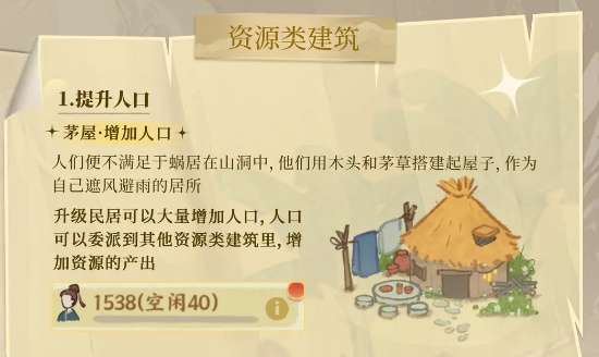 茅屋的主要是用来增加人口的,获取到足够的人口,可以派遣到其他的资源类建筑里面,增加资源的产出。