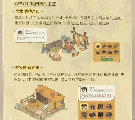 土灶可以产出食物,而畜牧场能产出肉,食物和肉可以用来提升建筑内部的科技。