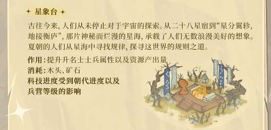 星象台能提升士兵以及名士的属性和资源产出量,不过科技进度会受到朝代进度和兵营等级影响。