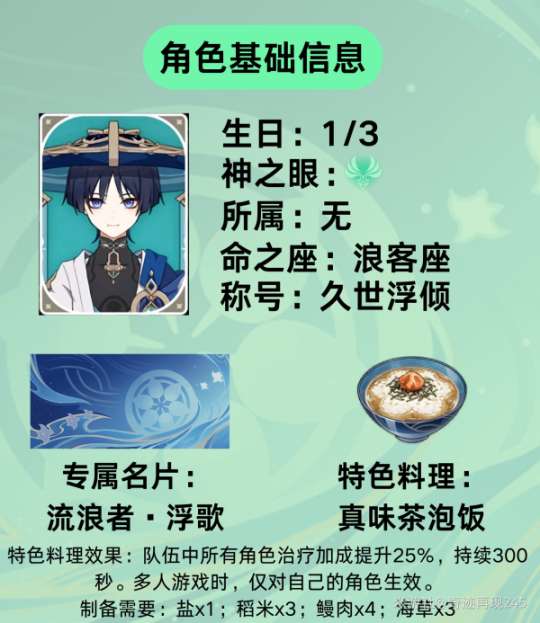 角色定位:流浪者是一名使用风系法器输出的角色,其特点是拥有独特的浮空输出机制,能够快速进行普攻且攻击距离较远,因此适合作为队伍的主要输出角色进行培养。