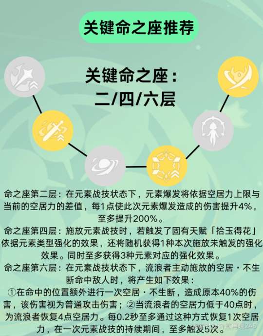④命之座推荐:每个命之座都能提升其输出能力,但不会对机制造成变化。其中,二命、四命、六命的提升效果更加显著。第二层命之座会使元素爆发的伤害在消耗至少50点空居力后,得到最大的200%提升,建议可以先使用元素战技,然后进行普通攻击,等待10秒左右再用元素爆发进行输出。第四层命之座可以额外获取一个固有天赋一的效果,可提供空居力、攻击力、暴击率和能量恢复等增益效果。第六层命之座显著提升元素战技的伤害和持续输出时间,大大提升了流浪者的输出能力。