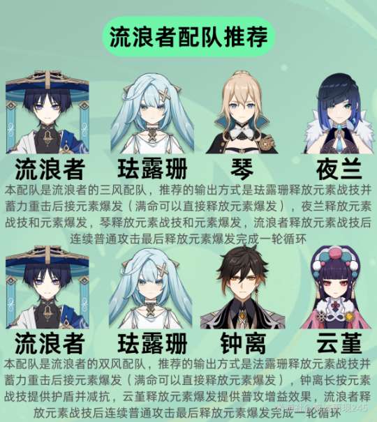 ⑤配队推荐:在流浪者的配队中,通常至少需要两个风元素角色,其中珐露珊是重要的风元素辅助。根据风元素角色的数量,可以将其分为双风队和三风队。流浪者扮演主DPS角色,珐露珊则是风系专门的辅助,还需要再搭配一个副DPS角色和一个生存辅助,这样配队就完成了。