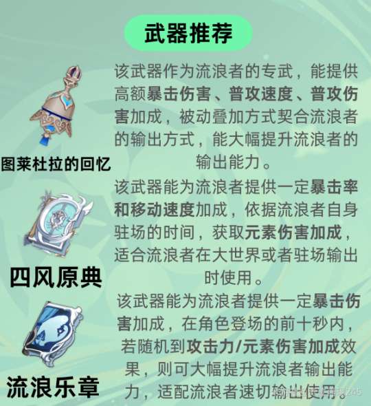 ②武器推荐:流浪者可选择不同种类的武器。对于他的专属武器“图莱杜拉的回忆”,最为适合。如果没有专属武器,可以考虑使用五星武器中的“四风原典”、“天空之卷”、“尘世之锁”(最好结合护盾角色使用)等武器。如果在四星武器中选择,推荐使用“流浪乐章”,在获取有效的增益效果后,瞬间输出能力会大幅提升。如果没有以上武器可供选择,可以考虑使用一些其他攻击伤害增益类武器,如“匣里日月”、“嘟嘟可故事集”、“纯水流华”等。