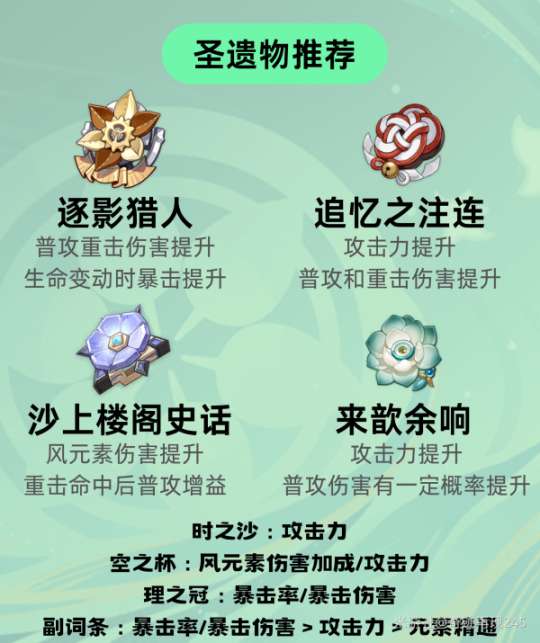 ①圣遗物推荐:对于流浪者而言,圣遗物的选择比较丰富。其中推荐使用沙上楼阁史话四件套,因为它可以提供普攻攻击速度加成和高额的增伤效果,有效地提升流浪者的输出能力,也是毕业时的首选圣遗物套装。另外,也可以选择追忆之注连/来歆余响四件套,虽然增伤效果略低于楼阁套,但同样可以起到提升输出的作用。如果流浪者处于生命值常常起伏变化的环境中,还可以考虑使用逐影猎人四件套。在前期,可使用攻击二件套+风伤二件套过渡。