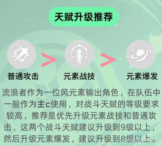 ③天赋推荐:作为输出角色的流浪者,建议在资源允许的情况下尽可能升级战斗天赋。在实战中,流浪者通常会开启元素战技后进行普通攻击。值得注意的是,元素战技具有特殊的「空居力」机制。如果在不冲刺或改变高度的情况下持续使用,可以维持十秒,并且接触水元素、火元素、冰元素或雷元素后,还可以获得空居力、攻击力、暴击率或能量恢复加成。在元素战技即将结束时,可以释放元素爆发作为本轮输出的收尾。