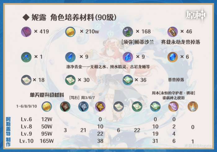 ⑥妮露的绽放玩法队内只能有水、草元素角色,且各至少1名,绽放反应的伤害多为水元素角色触发(即草底水触发);高命座时可考虑水伤玩法(如妮露/香菱/万叶/夜兰等)。