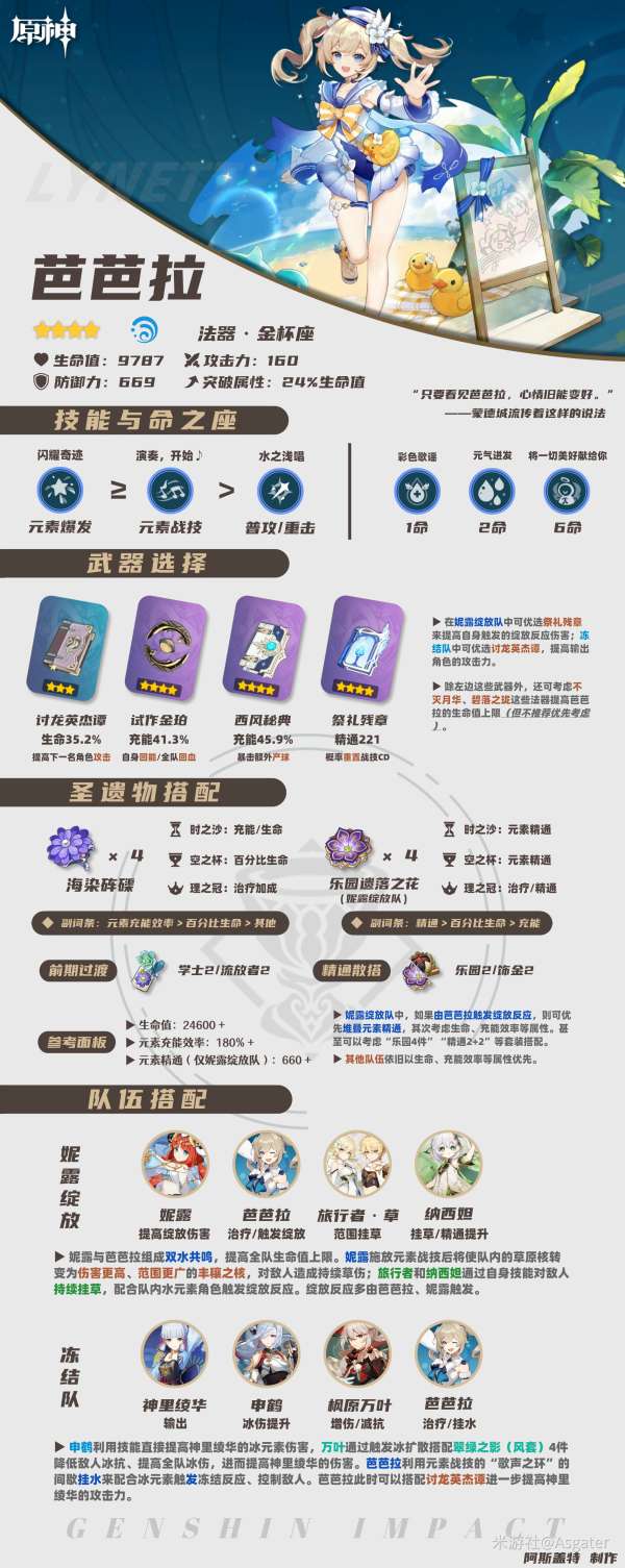 ①同作为水元素治疗法器角色,芭芭拉的部分玩法与珊瑚宫心海有相似之处,也可组冻结队、堆叠精通进入妮露绽放队。
