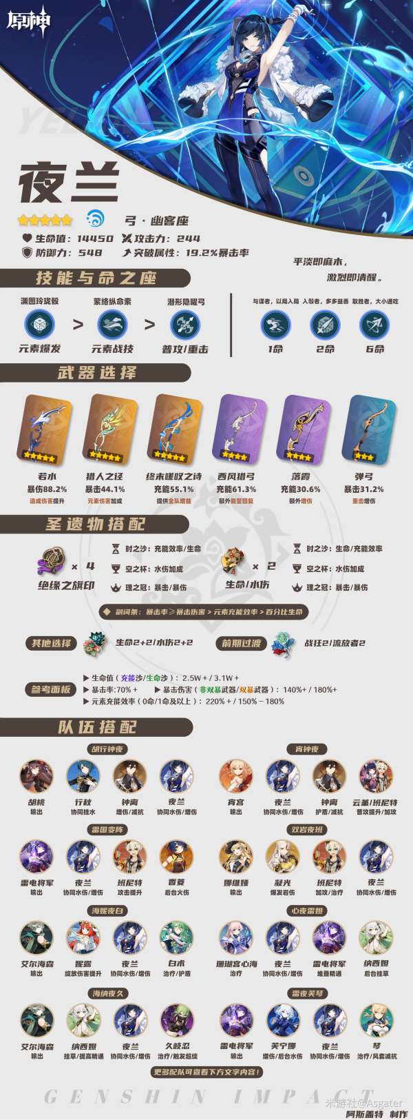 搭配双水、解锁1命使得充能要求降低时,可将暴击率提高至70%以上,暴击伤害(非双暴/双暴武器)可提高至140%/180%以上。