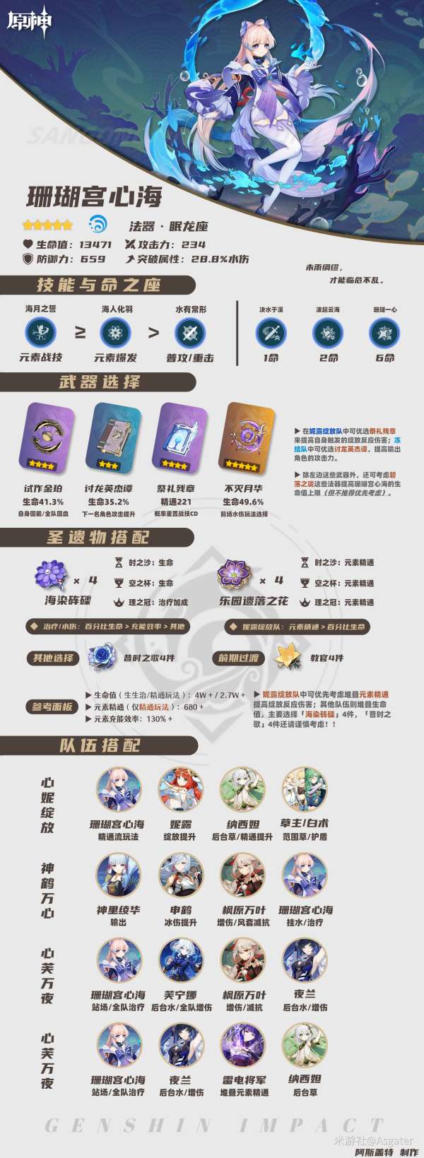③单水与双水、6命与非6命的充能有不同要求——单水、非6命推荐充能在250%以上;单水、6命推荐充能在210%左右;双水、非6命推荐充能在200-220%之间;双水、6命推荐充能在180-200%之间。
