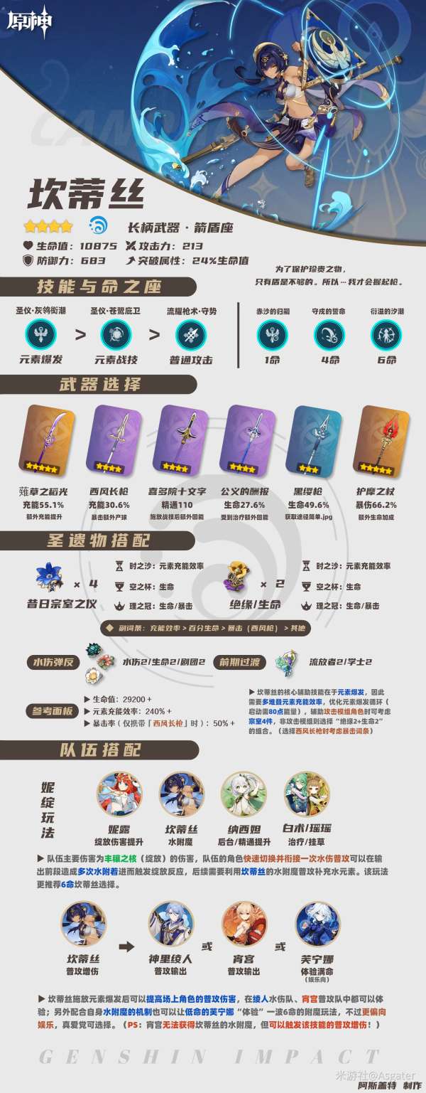 ③目前坎蒂丝的诸多配队更多是真爱党,或前期角色不多暂时使用时考虑;可选择配合自身元素爆发的水附魔机制站场的玩法;还有配合“行秋+夜兰+钟离”的“水王帝君”玩法;还可选择配合“行秋/瑶瑶/妮露”的妮绽放玩法。