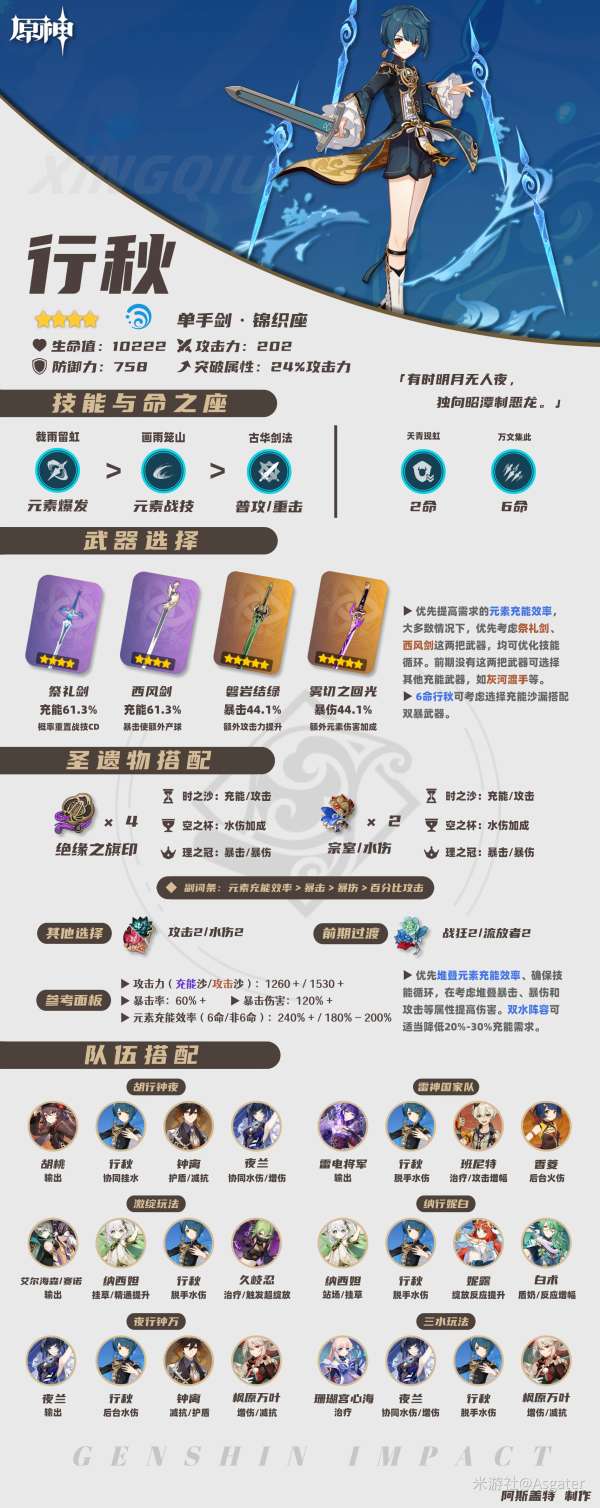 ①武器优先选择祭礼剑、西风剑,队伍想要进一步提高行秋输出的玩家可以考虑“充能沙漏+双暴武器”的搭配(更推荐6命选择)。