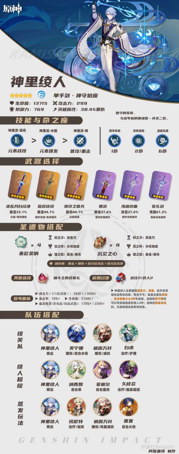 ③随着芙宁娜的登场,神里绫人在水伤输出队伍中可考虑搭配芙宁娜,此时队内需要搭配一名群体治疗角色(白术、夏洛蒂等);还可体验超绽放、蒸发反应队伍。