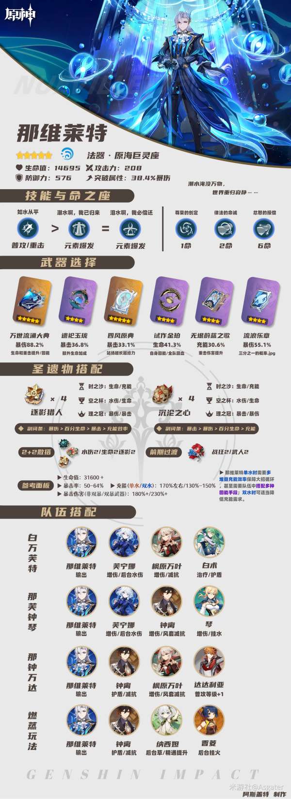⑥那维莱特自身伤害充足,其配队主要围绕“尽可能多地触发不同水元素反应(至多3种)”。目前的主要配队是水伤直伤输出队伍,如白万芙特、那芙钟琴、那钟万达等;还有依靠重击附着规则配合组成的“燃蒸玩法”,如那维莱特/钟离/纳西妲/香菱(此队香菱尽可能高地堆叠元素充能效率)。