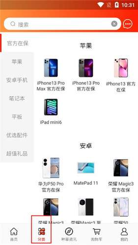 2、 点击分类,它为用户提供了苹果、安卓、笔记本、平板等分类可供用户选择;