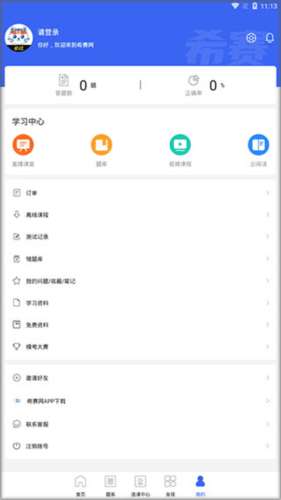 5、【我的】页面显示的是用户账号主体的一些基本信息,其中包括了学习中心、笔记资料、答题记录等,同时也包括了软件的相关设置。