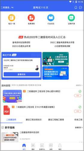 1、打开二级建造师助手app进入【首页】之后,最上方显示的是考试倒计时,下方则是分为了常用功能、资料获取、新手指南等几个板块。