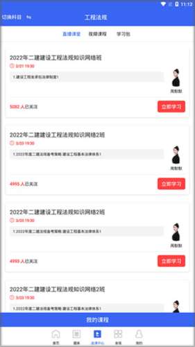 3、【选课中心】这里分为了三大类,分别是直播课堂、视频课程、学习包,用户可根据自己的需要进行学习,左上角还可以切换二建科目。