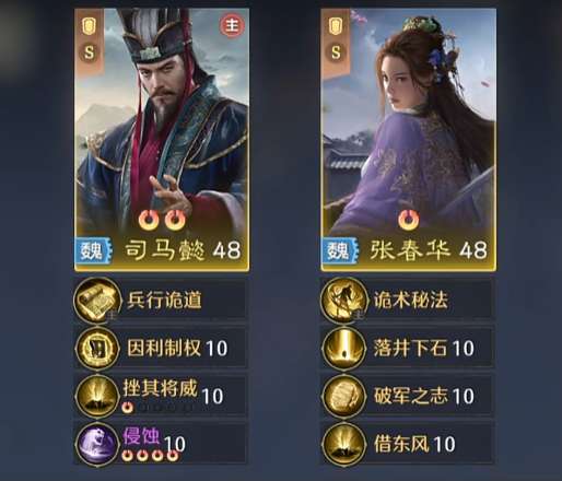 虽然在这里带来的是法术输出的一个提升能力,但是后期他在他的挫其将威之后还可以提升对于对面将领的一个削弱效果,所以在这里的司马懿强度上面来说的话,他也是属于可以给曹操带来加成的一个角色,张春华可以带的则是借尸还魂以及君心我心,在这里战斗当中,这两个技能可以增加张春华各项属性效果,可以带来的中毒持续输出能力也会更强,而且可以在层数叠加足够的时候也为队伍带来足够的输出提升。