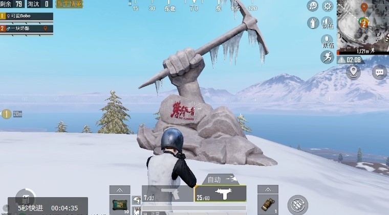 最后,我们来讲一下雪地图的神秘冰块和“攀登者”雕像。基本上,雪地图上相同内容的玩法与上述所讲的海岛图是一样的,同样在雪地图的高山上有一个“攀登者”雕像。特种兵也可以在周围搜索到可供“凿冰”的神秘冰块。但是,得益于雪地图与生俱来的天气环境,特种兵在这里体验“攀登者”元素的游戏内容,可以说是身临其境,更加真切。雪地图上的神秘冰块和“攀登者”雕像在地图东南方的那处高山上。不过,相比较于海岛图的山峰,这处被冰雪覆盖的山峰攀登难度较大一些,特种兵需要耐心地去寻找较佳的攀登路线!祝愿每一位特种兵都能奋力拼搏,勇攀高峰!