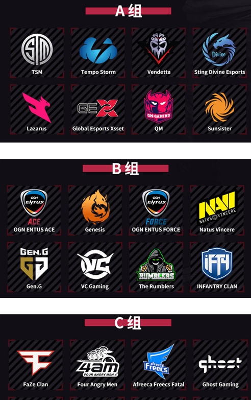 C组:4AM 、Faze、AFF、Ghost、T1、AHQ、WCK、RED;